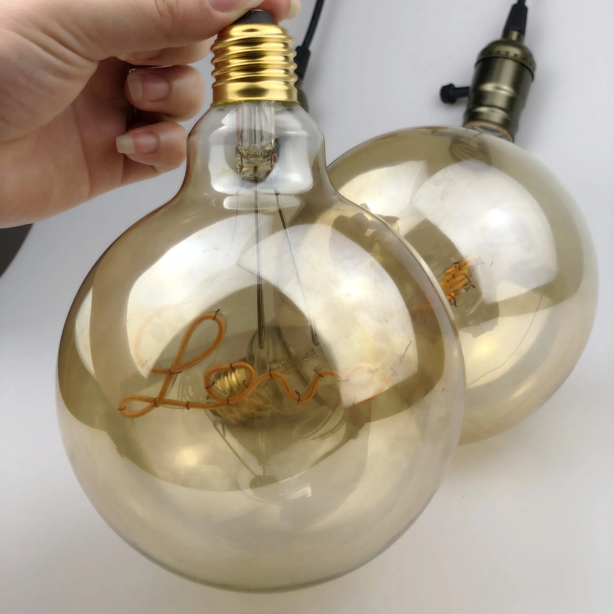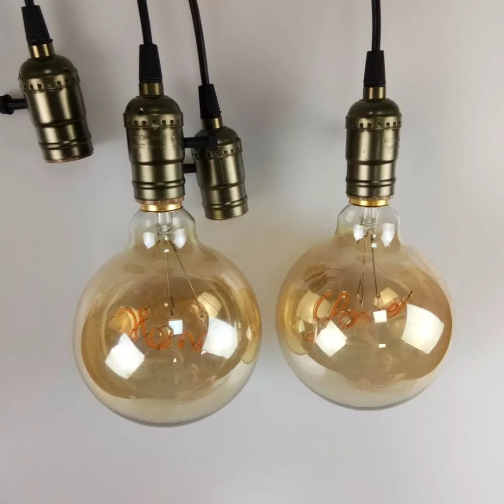Decorative Single Curved Filament With "Love" "Home" Unique Word Design 5W E27 2000K Vintage Edison LED Golden Light Bulb G125ModelG125 Led bulbDimension125*175mmPower4W Input VoltageAC110-130V AC220-240VLight sourceFilament ledsQ'ty of Filament4pcsMaterialGlassCCT2700-6500KL......