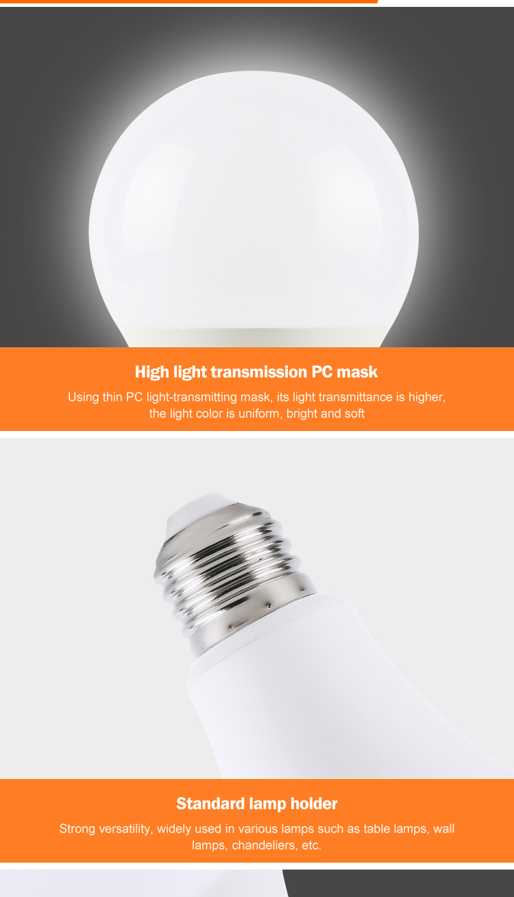 | A60-5W | 5W | 450lm | Φ60*112mm | E27/B22 | 70/80 | 270° | 2700-6500K | 0.5 / 0.9 | 2 years | 2,000 |