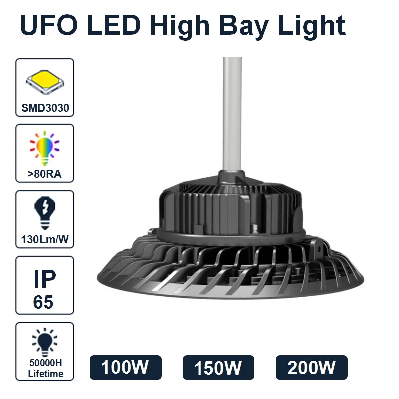 Product Description Product Name UFO LED High Bay Light Wattage 100W /150W /200W Efficacy 130Lm/W Voltage 100-277VAC PF >0.95 IP 65 Beam Angle 60 /90 /120 Degree Lifetime >50000 Hours Warranty 5 YearsItem NOSizeWattsEfficacyPFCRIIPVoltageLifetimeBLF-HB01100Φ245*145mm100W130Lm/W>0.95......