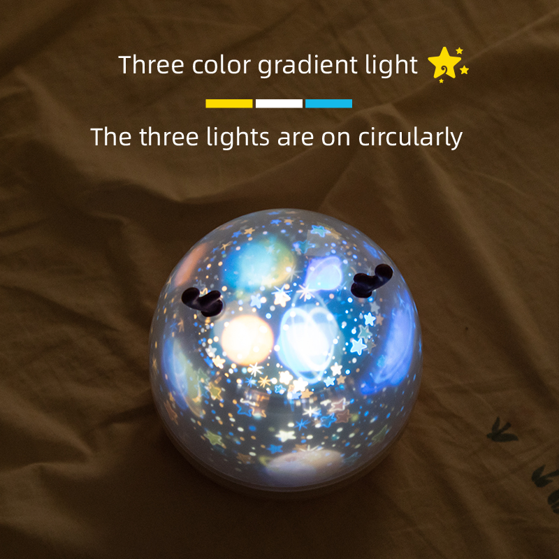 Product DescriptionSCute deer shape sky starry light Led desk lamp portable tricolor projection lamp for backgournd decoration children room Feature : 1. 3 color lighting: white ,yellow and blue lights can be displayed separately.2. 6 kinds of projection :fruit paradise ,the starry sky, sea world, ......
